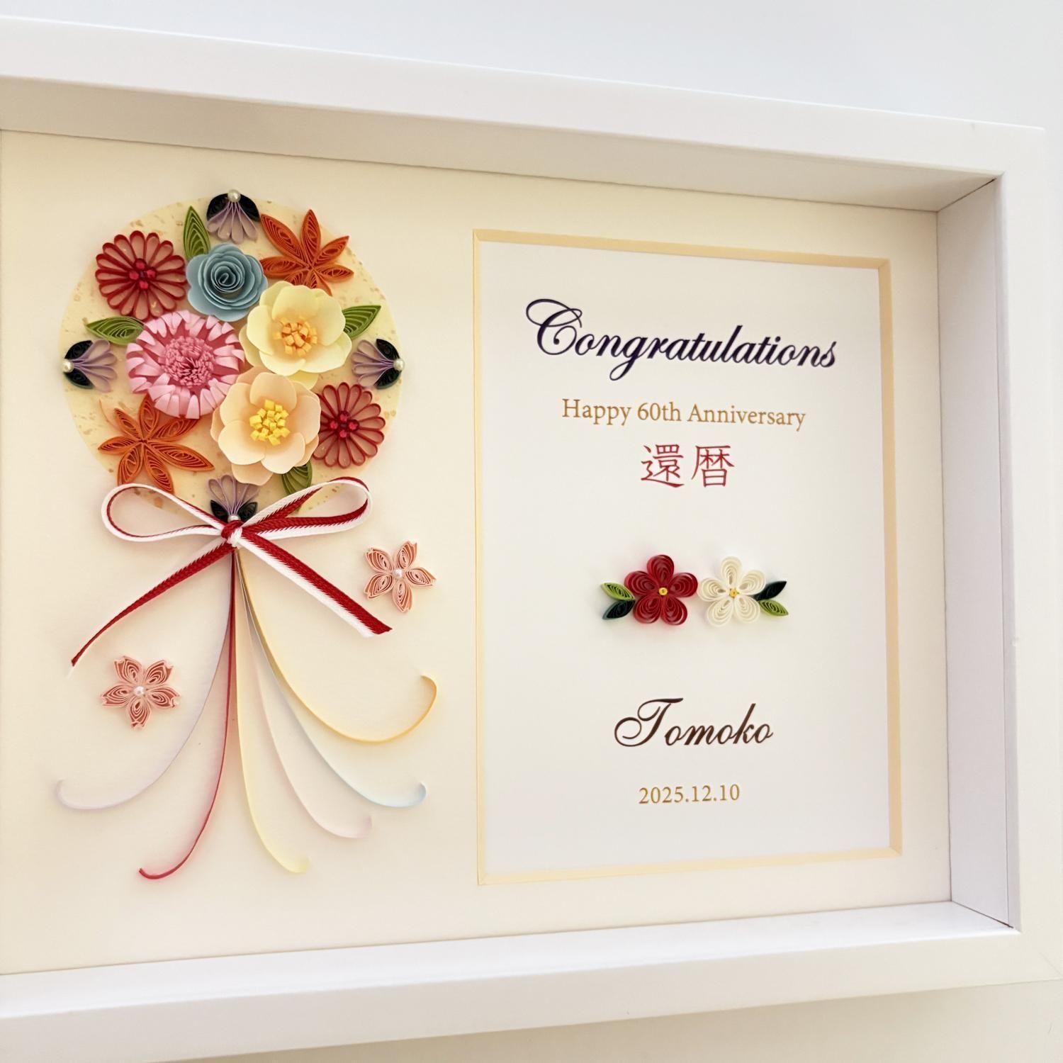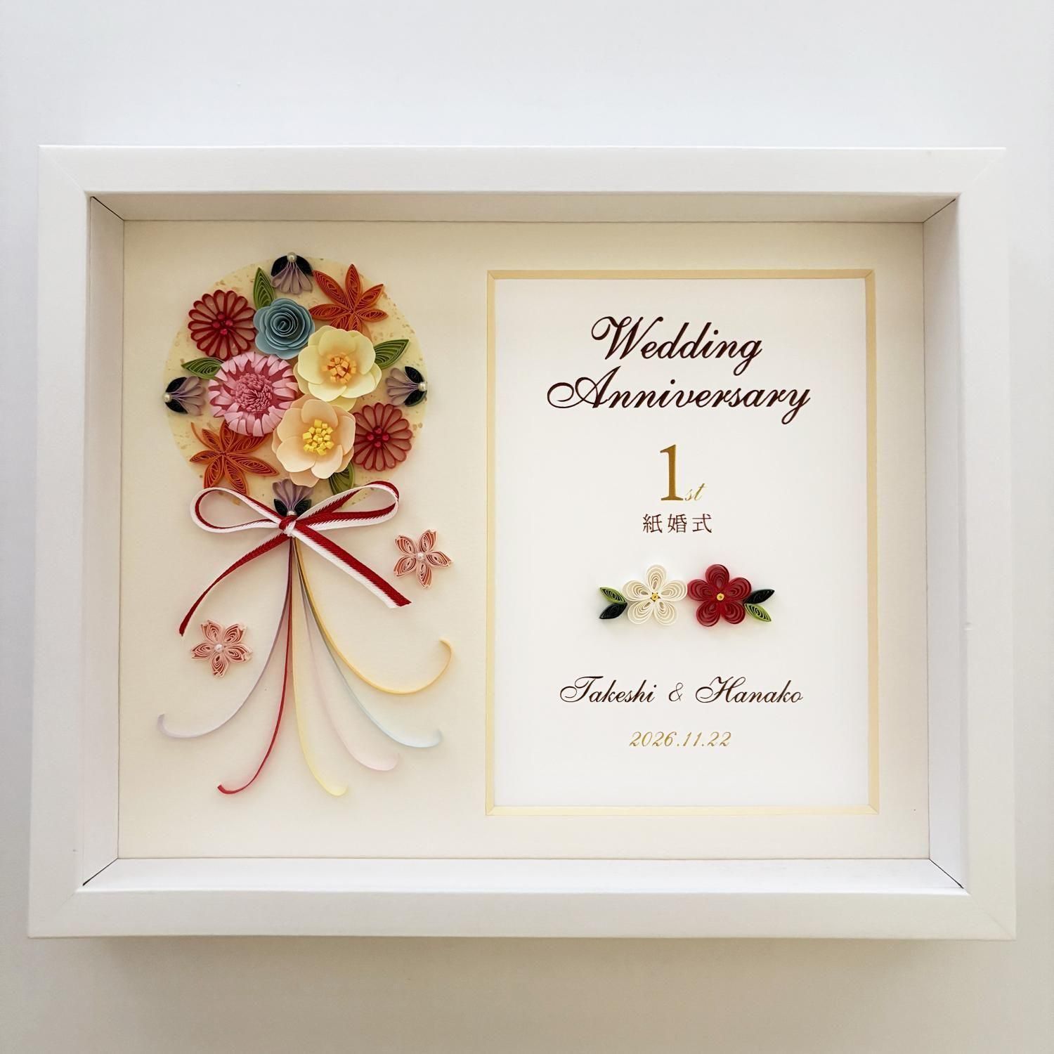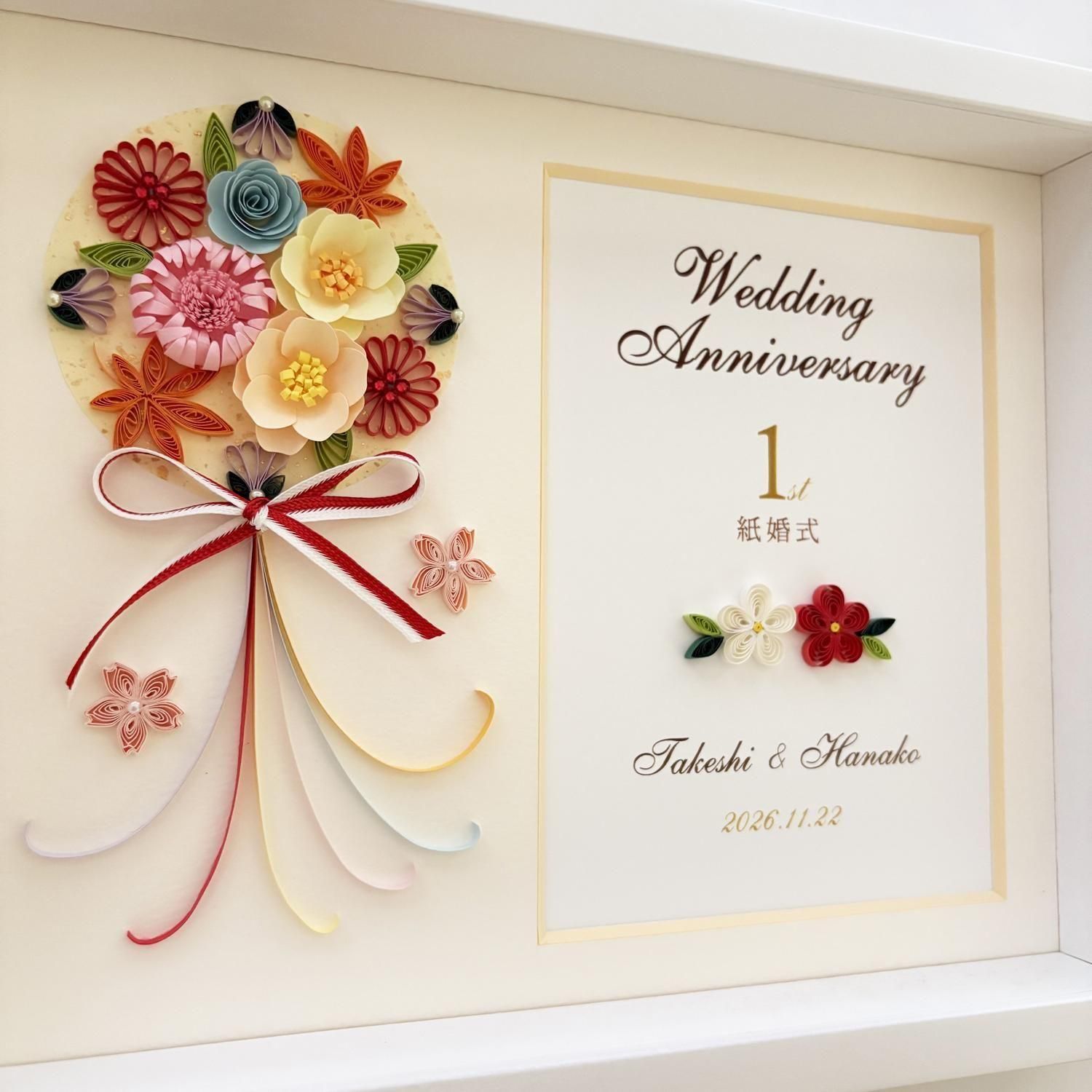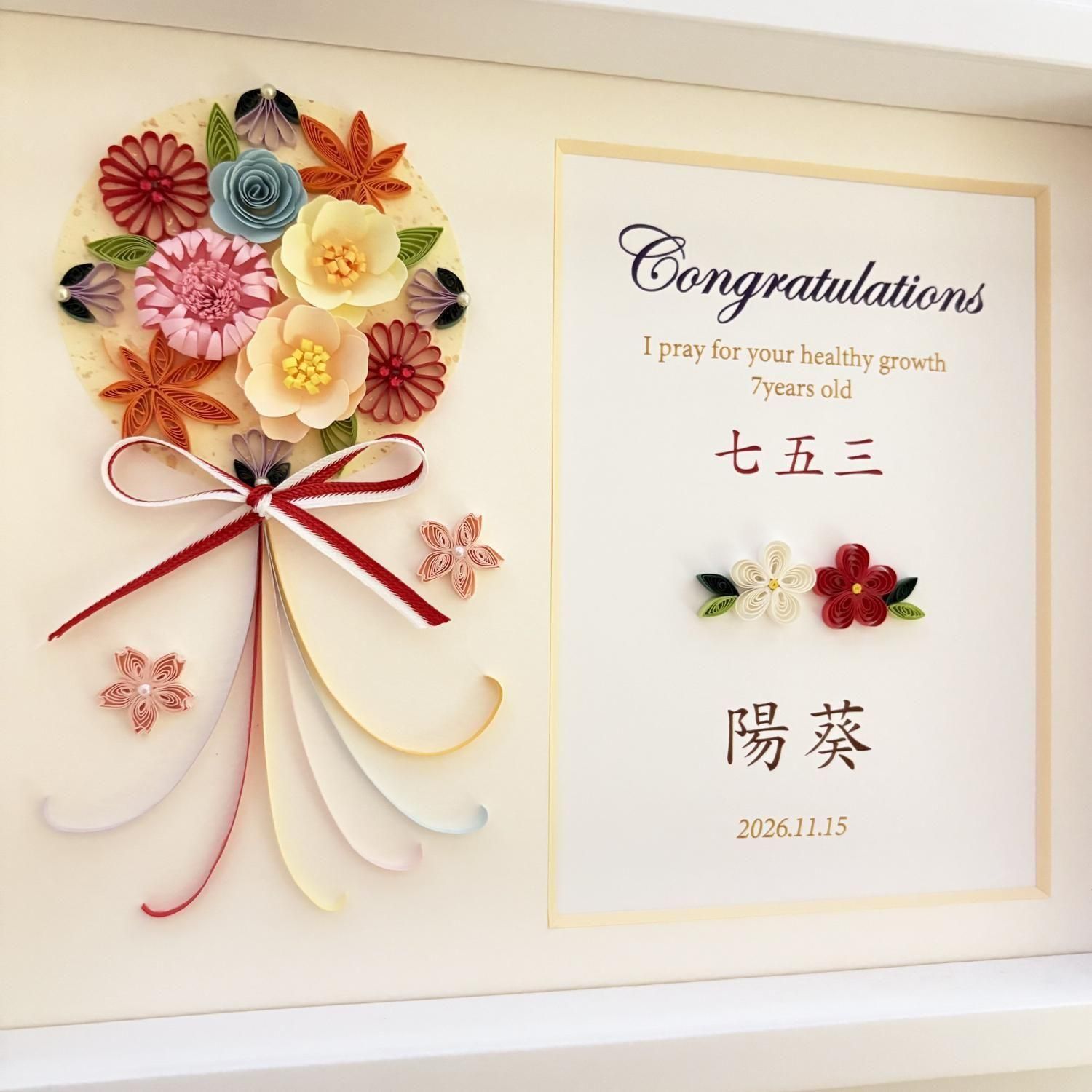 薬玉がもともと女の子の遊具として流行していたことから、女児のお宮参りや七五三の着物若い女性の晴れ着にも用いられる柄なので、七五三や和装の結婚式のウェルカムボードや結婚記念のフレームにもぴったりです。